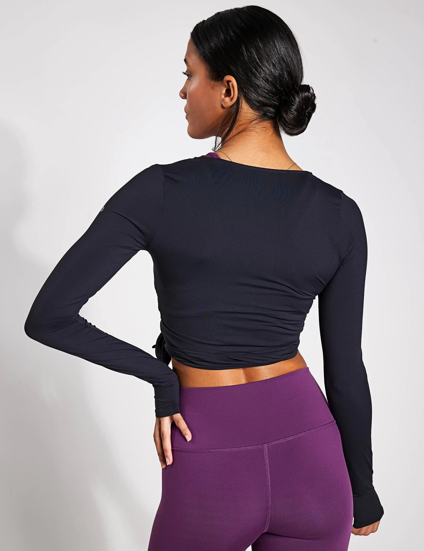 Short and sweet; Alo Yoga’s Cropped Escalate Wrap Top has a stylish wrap front, long sleeves and thumbholes. Cut from ultra-light performance jersey, it’s ideal for barre, body balance and flow.