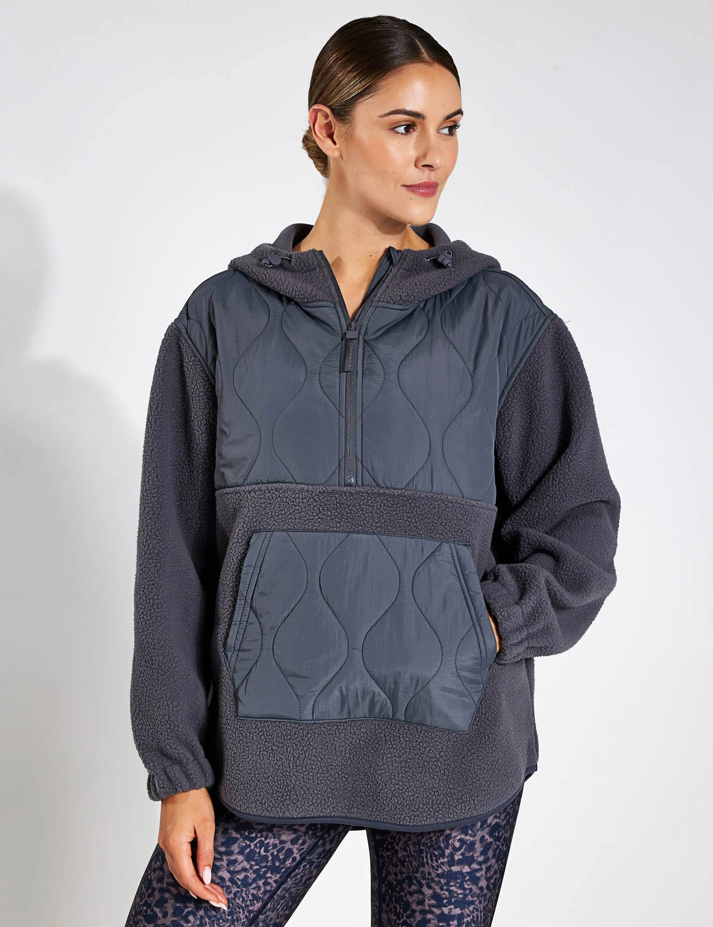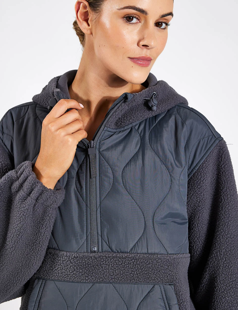 Conquer the early morning chill in the Mixed Borg Quilt Hoodie. The adjustable hood allows you to customise ventilation, while the kangaroo pocket keeps your essentials close at hand. Designed with a stylish curved hem at the back for added coverage and cuffed sleeves to keep the cold out.